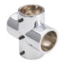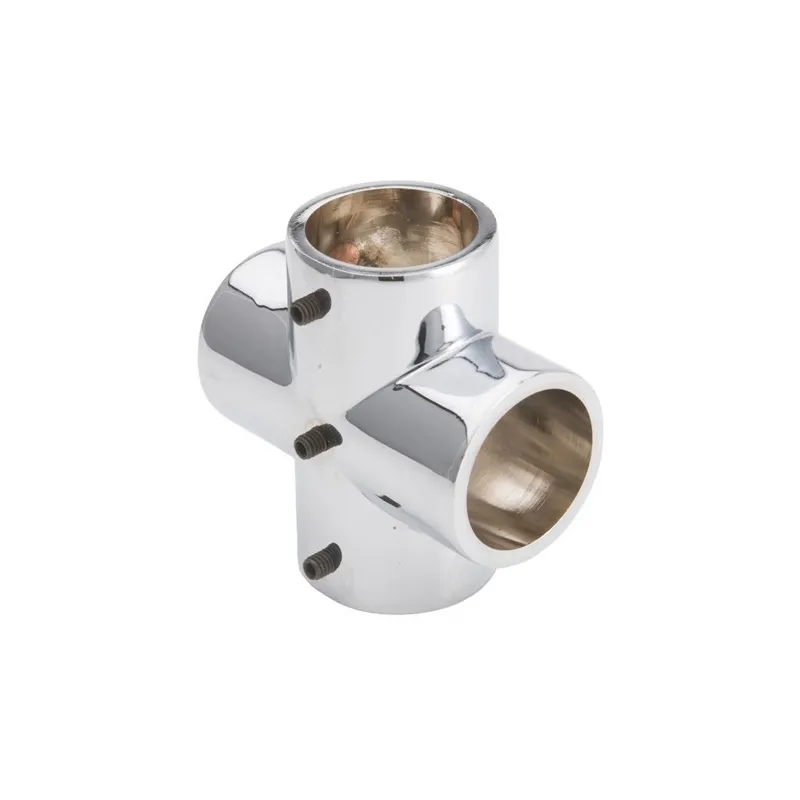 Złącze, łącznik czterokierunkowy z imbusem zaciskowym służy do łączenia rur fi 25mm pod kątem 90 st. Wykończenie w chromie.