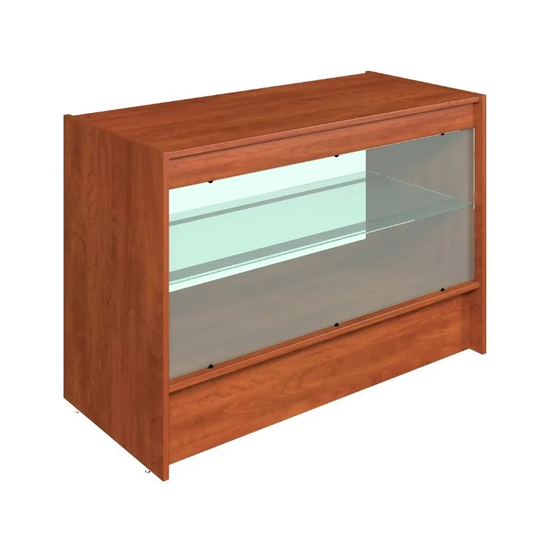 Lada sprzedażowa do sklepu, ze szklanym frontem i szklaną półką, prosta, blat pełny
