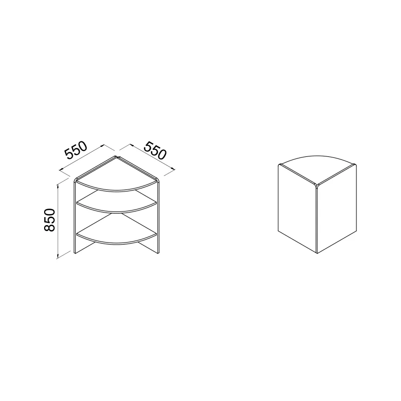 Lada sklepowa przeznaczona do obsługi kasowej klienta. Lada w całości wykonana z płyty meblowej. Lada narożna, wewnętrzna, z dwiema półkami.