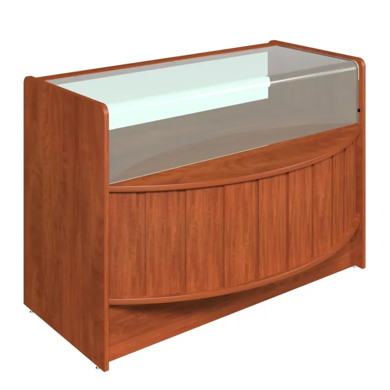 Lada sklepowa przeznaczona do obsługi kasowej klienta, oraz ekspozycji towaru. Lada posiada blat szklany gięty. Front lady wypukły.