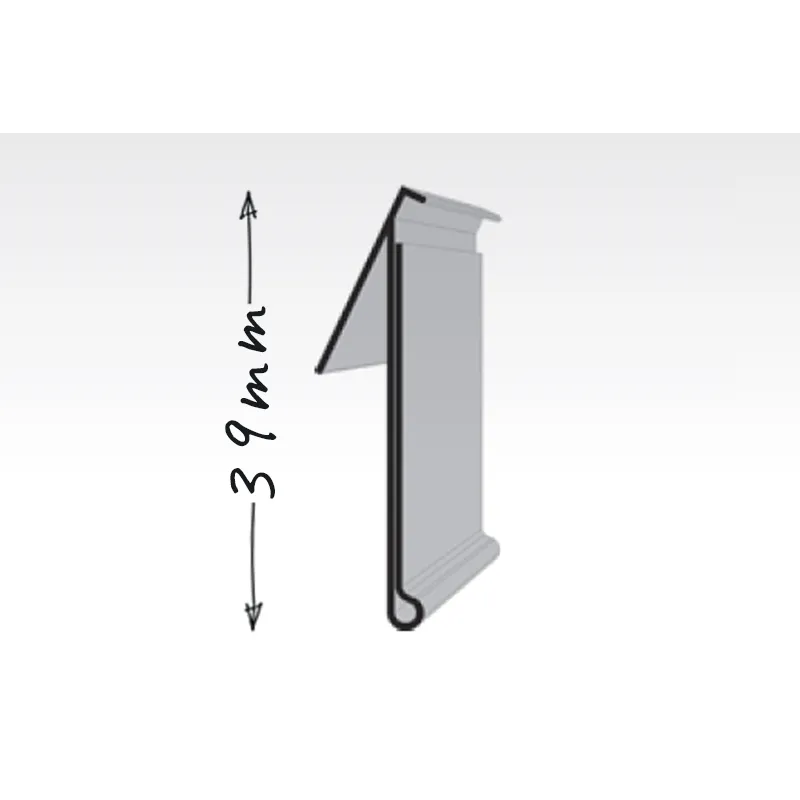 Listwa cenowa NO39 ma 39 mm wysokości. Przednia osłonka jest zawsze bezbarwna. Osłonka utrzymuje cenówkę w listwie i chroni ją przed kurzem i zabrudzeniami.