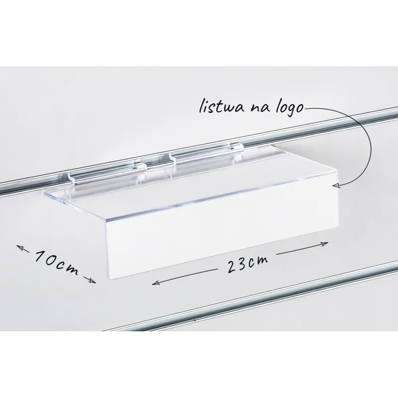 Półka Slatwall 23x10cm, pozioma, z listwą na logo