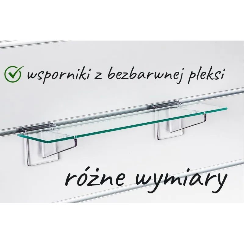 Półka wykonana ze szkła 4mm grubości, na system Spacewall. Półka występuje w ośmiu różnych wymiarach 40x10cm, 40x15cm, 40x20cm, 40x25cm, 60x10cm, 60x15cm, 60x20cm i 60x25cm. Dedykowana do prezentacji różnorodnych, lekkich towarów. Nadaje się do ekspozycji sztucznej biżuterii, obuwia dziecięcego, torebek wizytowych itp.. Półka opiera się na wspornikach bezbarwnych z pleksi. Półka nie zsuwa się ze wsporników dzięki gumowym przyssawkom. Ekspozytor można wykorzystać jako urozmaicenie ekspozycji ustawiając na nim najnowsze produkty.