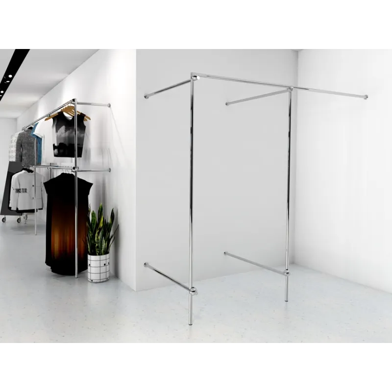 Przymierzalnia narożna, podwójna wykonana z rury stalowej, chromowanej o średnicy 25mm, elementów łączących chromowanych i czarnych stopek z tworzywa. W zestawie klucz imbusowy i instrukcja montażu. Przymierzalnia przeznaczona do samodzielnego złożenia.