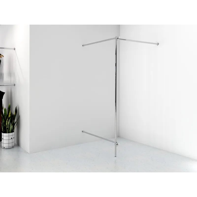 Przymierzalnia narożna, pojedyncza, wykonana z rury stalowej, chromowanej o średnicy 25mm, elementów łączących chromowanych i czarnych stopek z tworzywa. W zestawie klucz imbusowy i instrukcja montażu. Przymierzalnia przeznaczona do samodzielnego złożenia. Dodatkowy drążek dolny umożliwia montaż boku z płyty meblowej i stabilizuje przymierzalnię.