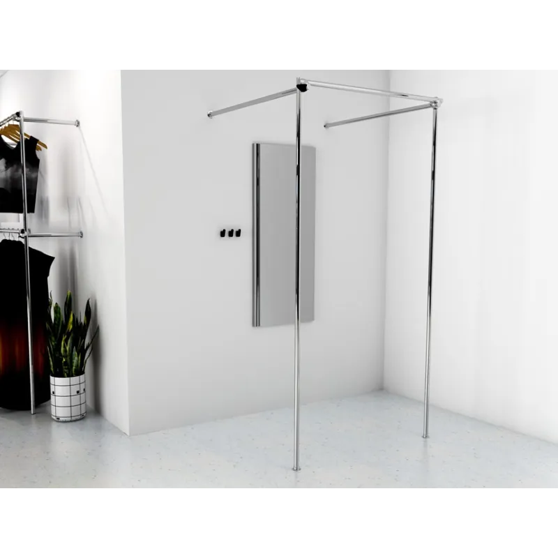 Przymierzalnia przyścienna, pojedyncza, wykonana z rury stalowej, chromowanej o średnicy 25mm, elementów łączących chromowanych i czarnych stopek z tworzywa. W zestawie klucz imbusowy i instrukcja montażu. Przymierzalnia przeznaczona do samodzielnego złożenia.