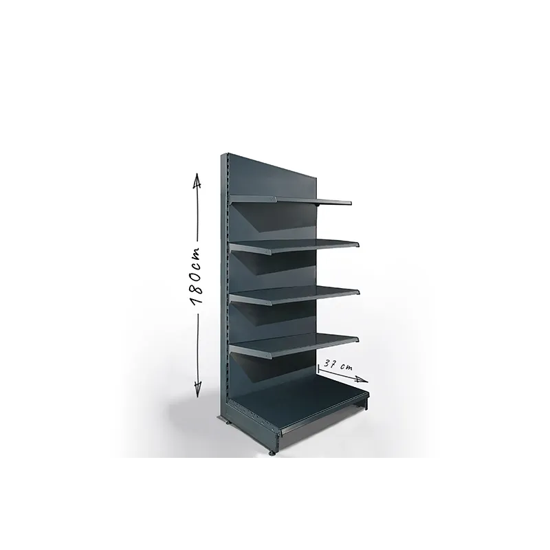 Regał sklepowy jednostronny z 5 metalowymi półkami, o wysokości 180cm. Regał metalowy do sklepu. Do wyboru jest pięć kolorów podstawowych i cztery szerokości segmentów.
