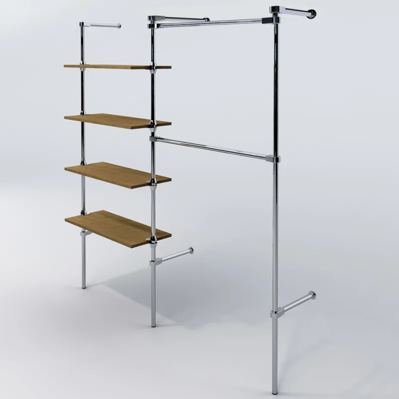 Wieszak, stojak do garderoby lub sklepu odzieżowego, dwa poziomy, mocowany do ściany, z 4 półkami, przeznaczony do ekspozycji odzieży bokiem. Wykończenie w chromie.