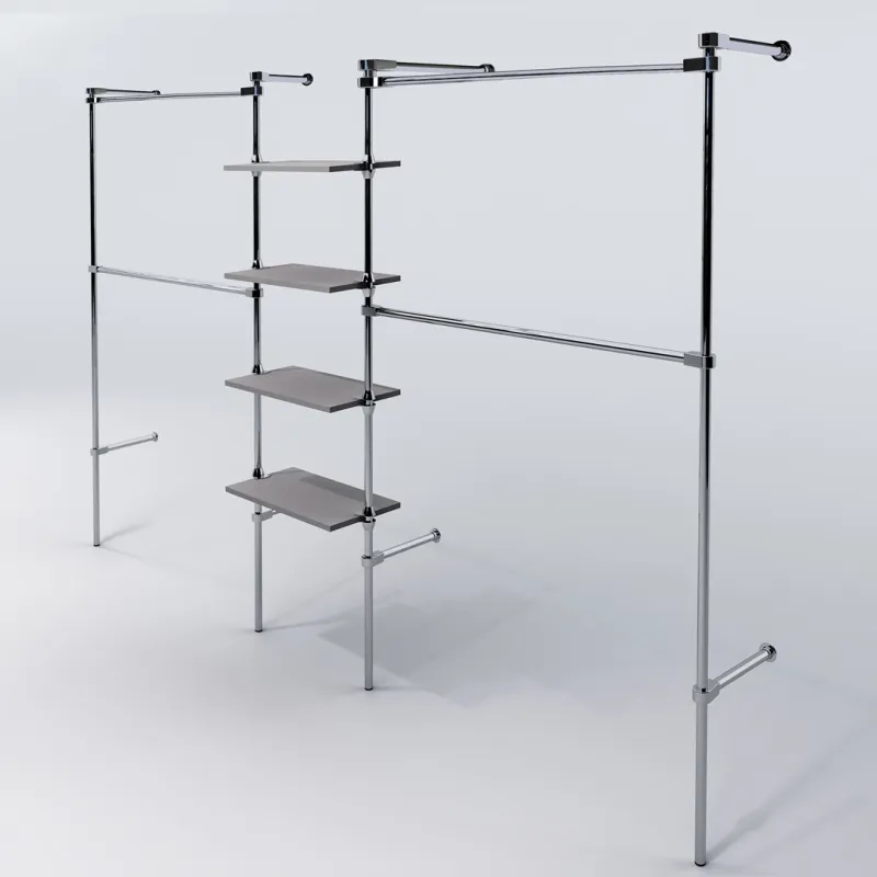 Wieszak przyścienny, dwupoziomowy z czterema półkami, wykonany z rury stalowej o średnicy 25mm oraz elementów łączących. Wszystkie elementy stalowe wykończone w chromie. Półki z płyty meblowej o gr. 18mm z obrzeżem PCV.