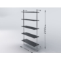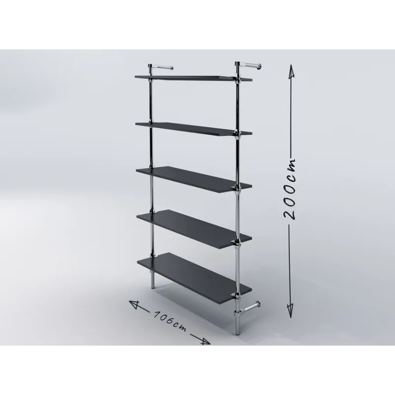 Regał przyścienny, wykonany z rury stalowej, chromowanej o średnicy 25mm, elementów łączących chromowanych i czarnych stopek z tworzywa. Półki z płyty meblowej o grubości 18mm z płynną regulacją poziomu.