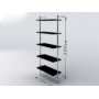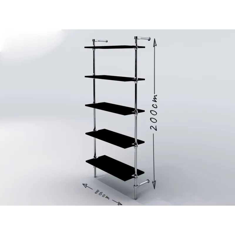 Regał przyścienny, wykonany z rury stalowej, chromowanej o średnicy 25mm, elementów łączących chromowanych i czarnych stopek z tworzywa. Półki z płyty meblowej o grubości 18mm z płynną regulacją poziomu.