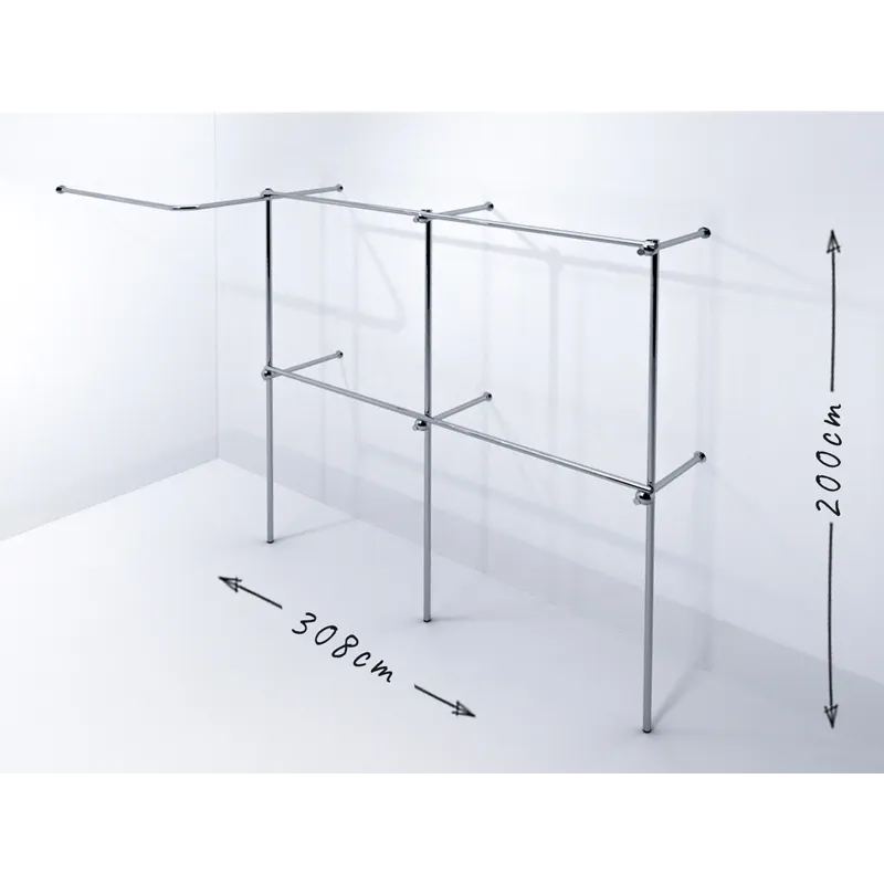 Wieszak narożny z przymierzalnią, wykonany z rury stalowej, chromowanej o średnicy 25mm, elementów łączących chromowanych i czarnych stopek z tworzywa. W zestawie klucz imbusowy i instrukcja montażu. Wieszak przeznaczony do samodzielnego złożenia.
