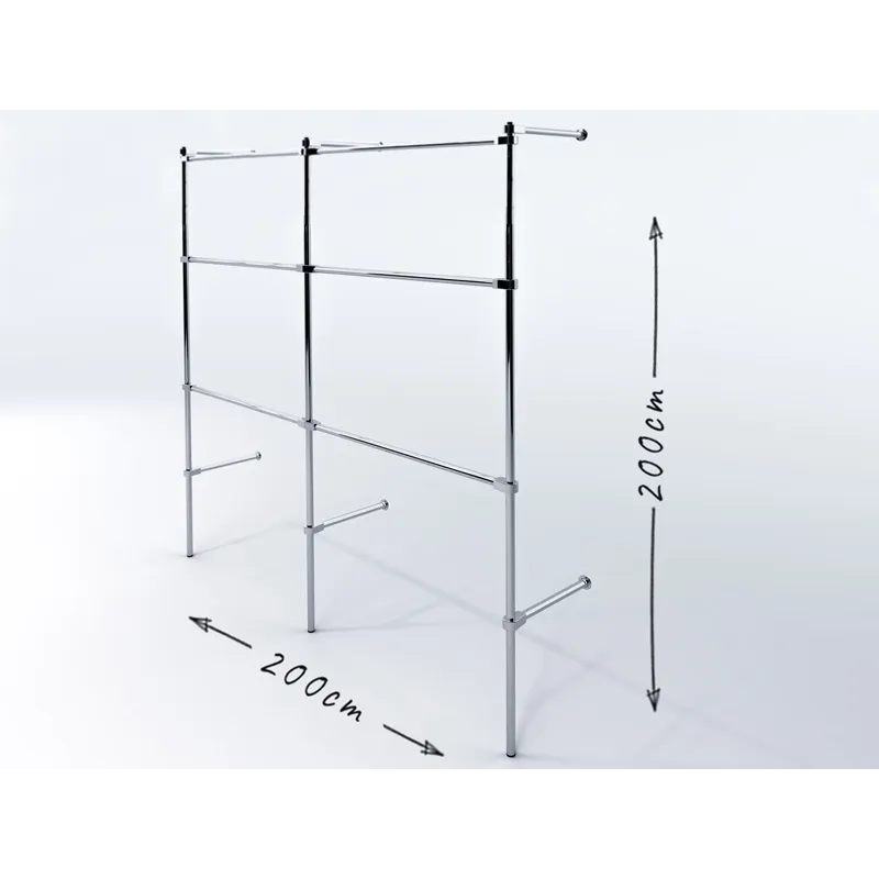 Wieszak przyścienny, wykonany z rury stalowej, chromowanej o średnicy 25mm, elementów łączących chromowanych i czarnych stopek z tworzywa. W zestawie klucz imbusowy i instrukcja montażu. Wieszak przeznaczony do samodzielnego złożenia. Dwa dolne drążki można zamontować na dowolnej wysokości co pozwala dopasować ekspozycję do asortymentu i rodzaju odzieży. Wieszak mocowany do ściany.