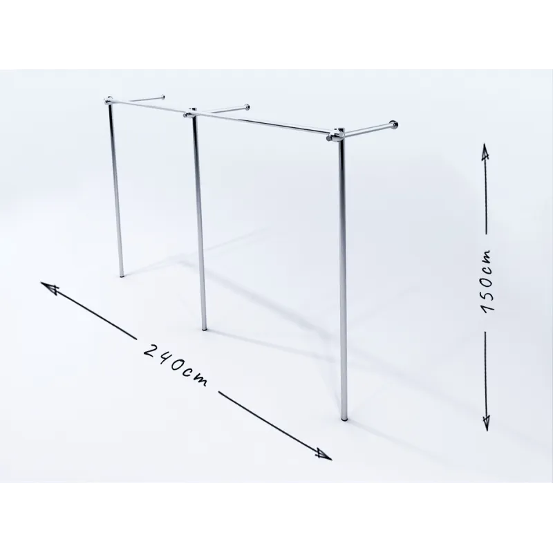 Wieszak wykonany z rury stalowej, chromowanej o średnicy 25mm, elementów łączących chromowanych i czarnych stopek z tworzywa. W zestawie klucz imbusowy i instrukcja montażu. Wieszak przeznaczony do samodzielnego złożenia.