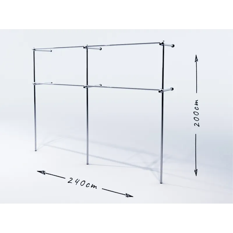 Wieszak przyścienny, wykonany z rury stalowej, chromowanej o średnicy 25mm, elementów łączących chromowanych i czarnych stopek z tworzywa. W zestawie klucz imbusowy i instrukcja montażu. Wieszak przeznaczony do samodzielnego złożenia. Wieszak mocowany do ściany.