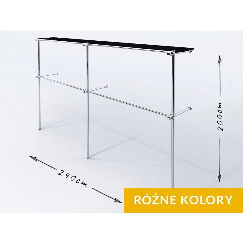 Wieszak przyścienny, wykonany z rury stalowej, chromowanej o średnicy 25mm, elementów łączących chromowanych, czarnych stopek z tworzywa i półki z płyty meblowej o gr. 18mm. W zestawie klucz imbusowy i instrukcja montażu. Wieszak przeznaczony do samodzielnego złożenia.